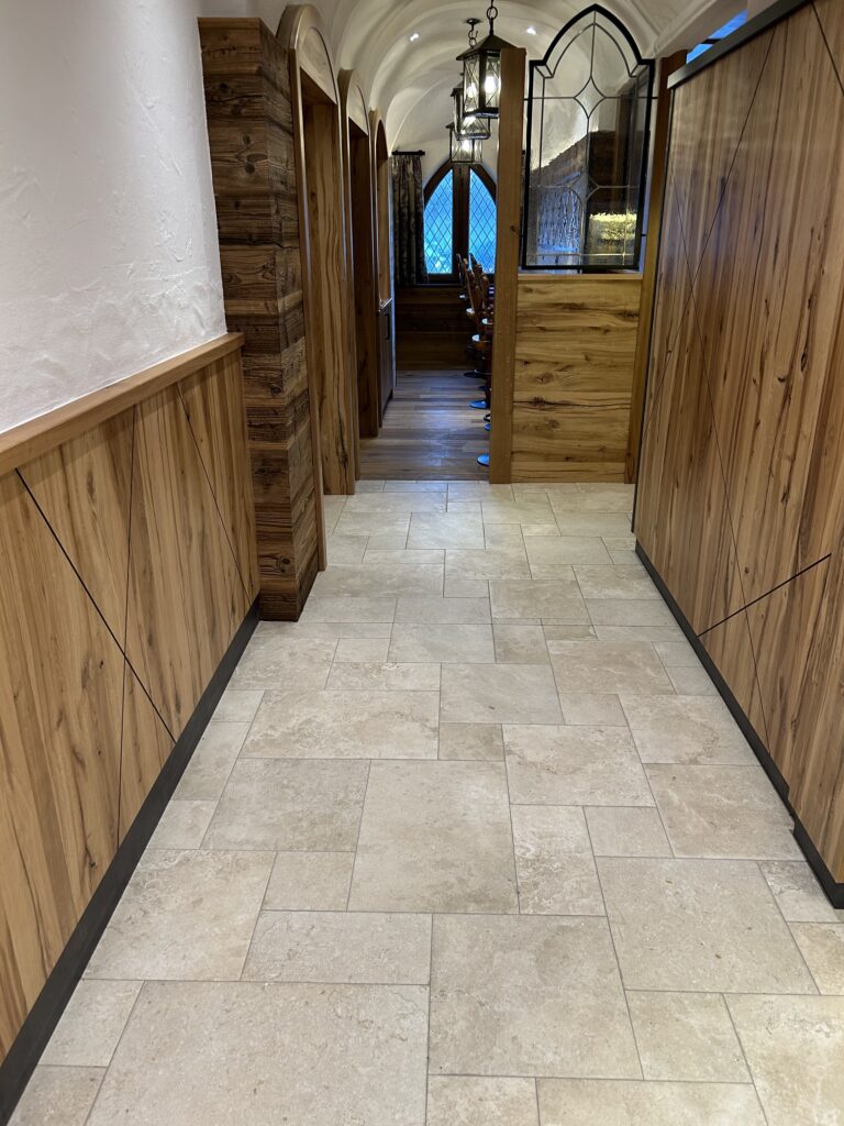 Der Fliesenboden wurde in hochwertiger Natursteinoptik gestaltet und harmoniert perfekt mit der historischen Architektur.